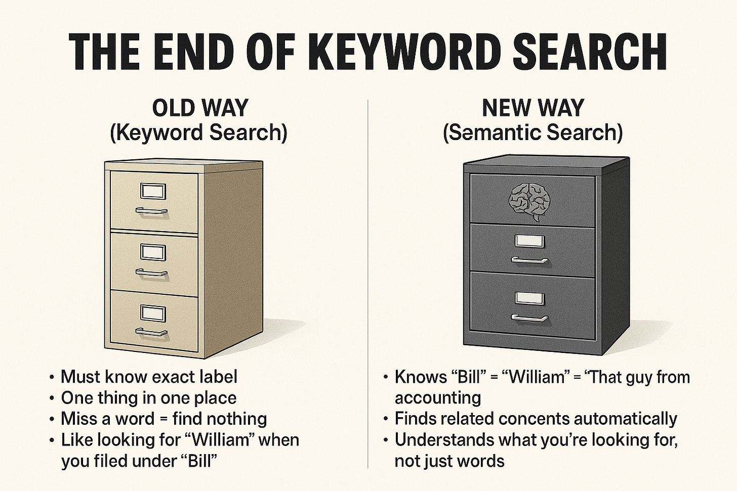 Traditional search is like having a filing cabinet where you can only find things if you remember the EXACT label you wrote. Miss one word? Sorry, that document doesn’t exist anymore.