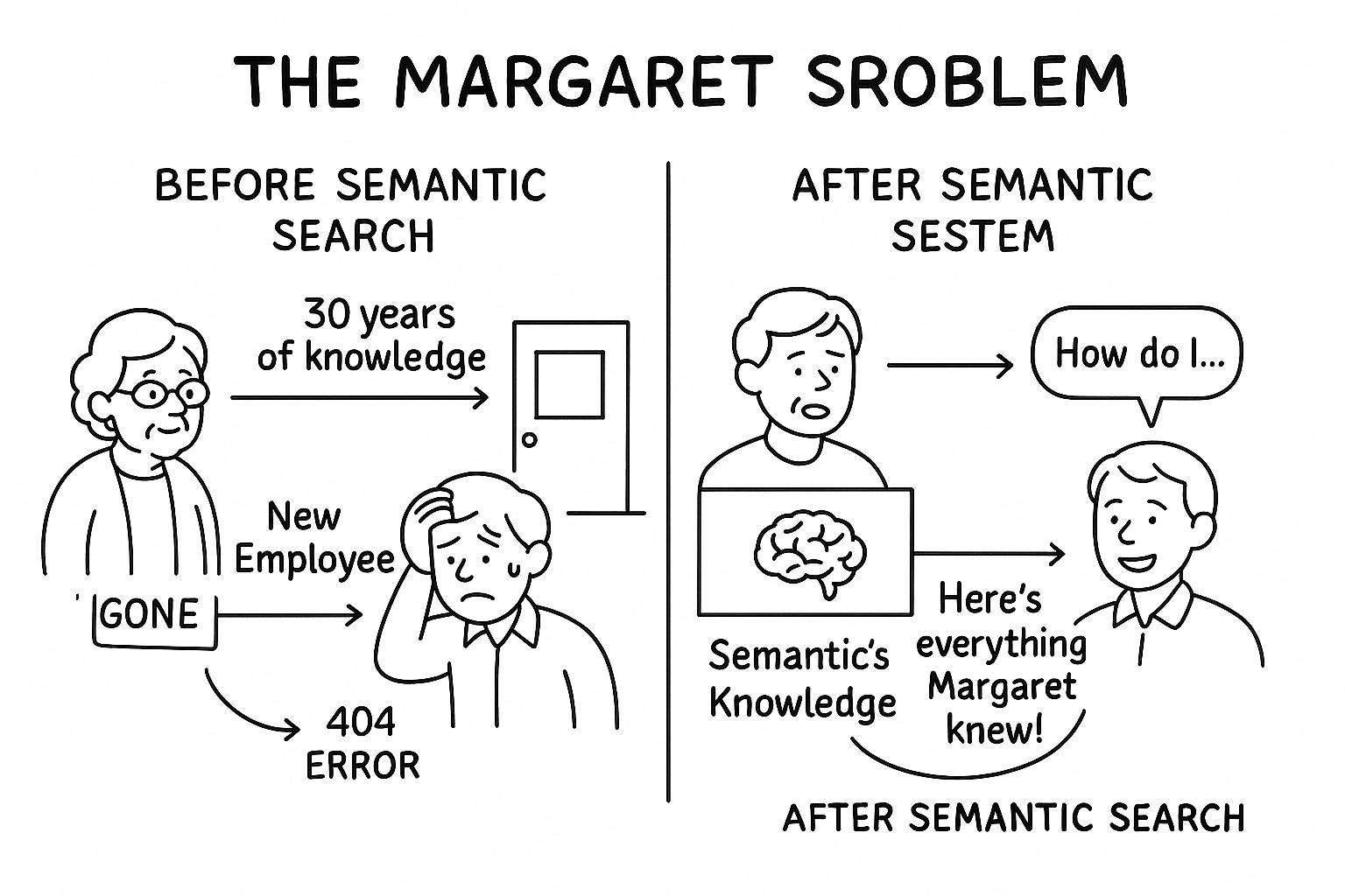 With semantic search, Margaret’s knowledge becomes immortal. New employees can search “How do we handle refunds?” and find:
