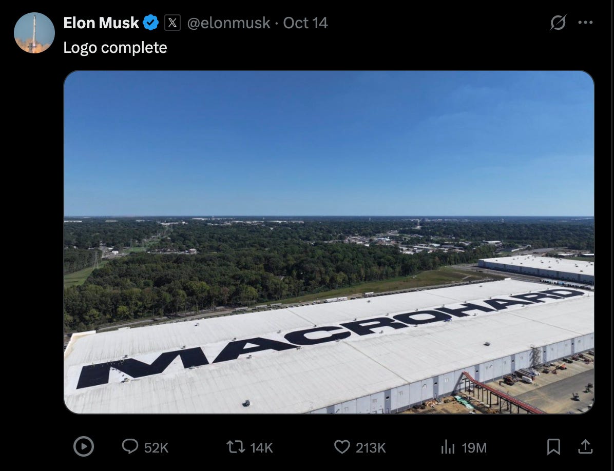 On October 14, 2025, at 7:18 AM, Musk tweeted “Logo complete” with an aerial photo showing “MACROHARD” painted across the roof of xAI’s massive Colossus II facility in Memphis, Tennessee. Within hours, it had 19 million views.