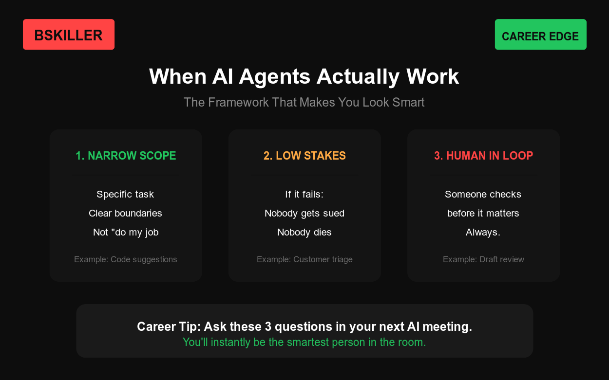 The technology is real. The marketing is fantasy. Use agents as tools, not replacements. Verify what they output. And whenever someone promises fully autonomous anything—ask for the failure rate.