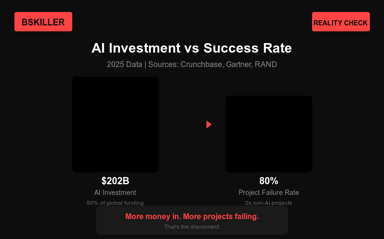 80% of AI projects fail. Not my opinion. Gartner’s numbers. RAND Corporation confirmed it—that’s twice the failure rate of non-AI tech projects. (Gartner)