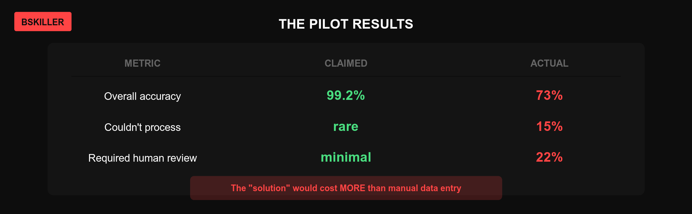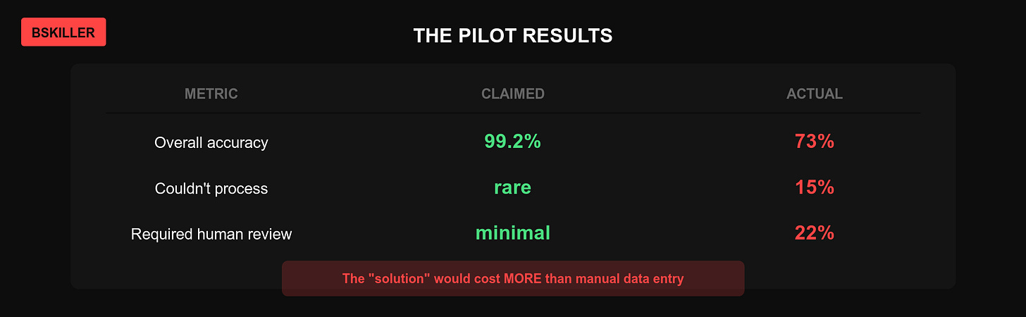The “$100K AI solution” would have cost more in human cleanup than doing data entry manually.