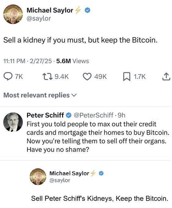 Note: Saylor’s “sell a kidney” comment was clearly hyperbolic rhetoric meant to emphasize his conviction about Bitcoin, not actual advice. The exchange highlights the intensity of the Bitcoin debate between prominent figures.